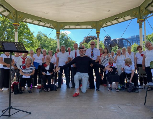 Choir singing in a show globe